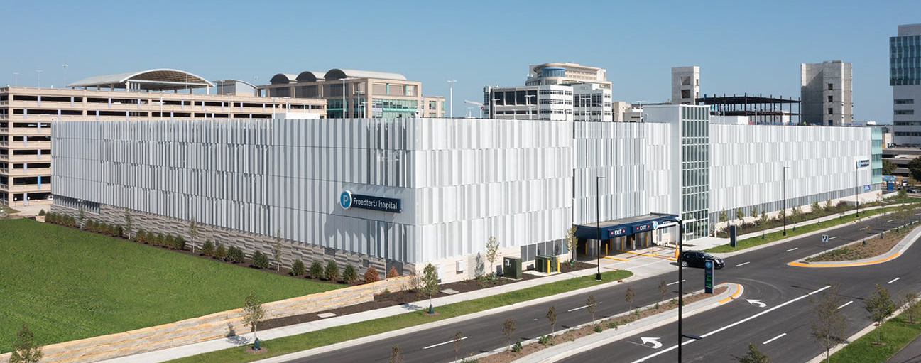 The Froedtert & the Medical College of Wisconsin health network, a Wisconsin-based top healthcare provider, recently expanded its Froedtert Hospital campus in Wauwatosa to meet an increasing need for patient care. The expansion included a 225,000-square-foot, nine-story patient tower, as well as a five-level, 2,400-stall parking structure with a pedestrian bridge. The new Froedtert Hospital Blue Parking Structure provides patients, staff, and visitors with a functional yet innovative approach to necessary infrastructure.